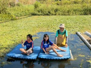 | 照片說明:介紹雙筒望遠鏡使用方法,師生一起觀察水雉。 | 照片說明:水雉棲地生態—搭乘膠筏體驗水上漂浮感覺。 | |