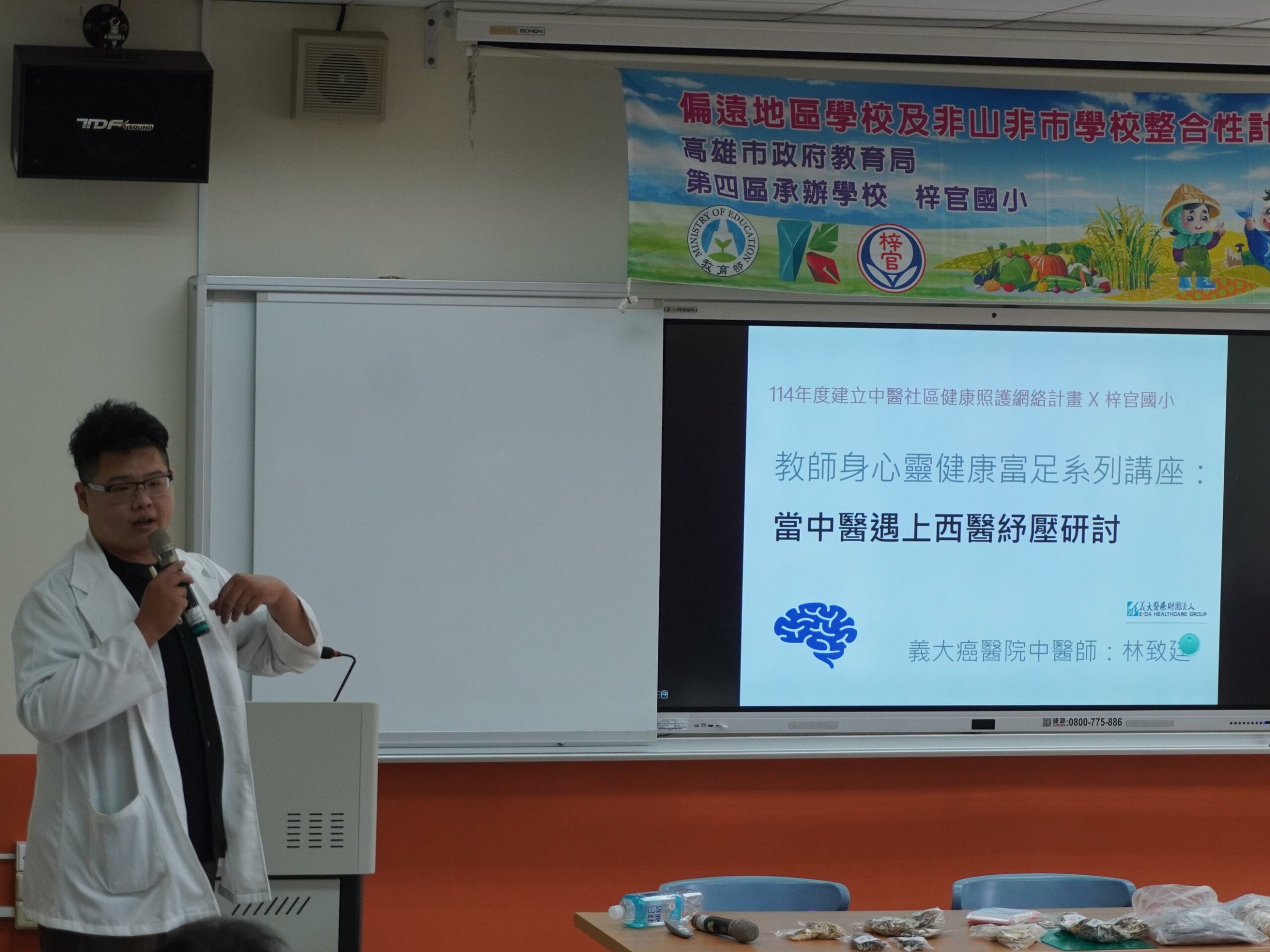 | 內容概述 | 這場為教師量身打造的「身心靈健康富足系列講座」,針對老師身兼多職、職場政治與久坐不動帶來的壓力焦慮,提出「健康老師才有健康學生」的觀點。活動邀請義大團隊林致廷醫師,整合中醫五臟調理與西醫壓力管理,提供全方位的職場生存解方。