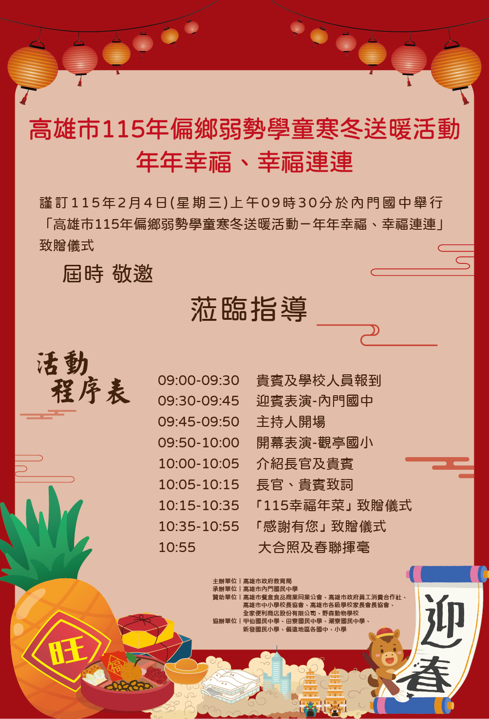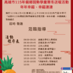 高雄市115年偏鄉弱勢學童寒冬送暖活動-年年幸福、幸福連連-成果 Post author:五區總中心 Post published:2026 年 1 月 26 日 Post category:114學年度 / 最新消息 高雄市115年偏鄉弱勢學童寒冬送暖活動 年年幸福、幸福連連 時間:115年2月4日(星期三)上午9:30分 地點:第三區內門國中邀請大家共襄盛舉致贈儀式 Tags: 成果展示 Read more articles Previous Post第一分區-教師增能-有愛無礙之教學玩很大成果 Next Post第五區成果分享-學生學力提升與多元展能-允文允武 You Might Also Like 第一分區-行政整合研習-放下不屬於你的重擔: 阿德勒「課題分離」的減壓教學法成果 2025 年 11 月 18 日 第一區-學童多元發展學習營-111年12月27日-活動預告 2022 年 12 月 22 日 第五區大樹國中辦理偏鄉教育學生科學實驗課程成果分享-113年1月31日(三) 2024 年 2 月 7 日